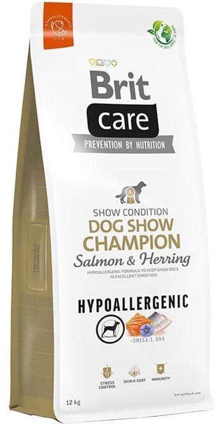 Brit Care Dog Show Champion 12 kg Hypoallergeen recept met zalm en haring voor volwassen honden Houdt tentoonstellingshonden in uitstekende conditie. Compleet voer voor honden. Samenstelling zalm (36 %) (gedehydrateerde zalm, gehydrolyseerde zalm), rijst (26 %), gedehydrateerde haring (14%), kippenvet, lijnzaad (4 %), gedroogde appelpulp, zalmolie (3 %), natuurlijke aromas, biergist, gedroogde algen (0,5 %, Schizochytrium limacinum), erwtenmeel, glucosamine (300 mgkg), fructo-oligosacchariden (230 mgkg), chondrotine sulfaat (230 mgkg), mannan-oligosacchariden (180 mgkg), yucca schidigera (180 mgkg), mariadistelzaad (110 mgkg), -glucanen (60 mgkg), gedroogde hartgespan (60 mgkg), gedroogde duindoorn (60 mgkg), probiotica Lactobacillus helveticus HA 122 genactiveerd (15109 cellenkg). Analytische bestanddelen ruw eiwit 26,0 %, ruw vet 16,0 %, vocht 10,0 %, ruwe as 5,8 %, ruwe vezel 3,0 %, calcium 1,1 %, fosfor 0,9 %, natrium 0,4 %, omega-3 vetzuren 2,1 %, omega-6 vetzuren 2,2 %, EPA (205 n-3) 0,1 %, DHA (226 n-3) 0,25 %. Nutritionele toevoegingsmiddelen per 1 kg vitamine A (3a672a) 23000 IU, vitamine D3 (3a671) 1700 IU, vitamine E (3a700) 550 mg, vitamine C (3a312) 350 mg, taurine (3a370) 1500 mg, choline chloride (3a890) 1800 mg, L-carnitine (3a910) 300 mg, vitamine B1 (3a821) 3 mg, vitamine B2 (3a825i) 11 mg, biotine (3a880) 4 mg, foliumzuur (3a316) 1,4 mg, vitamine B6 (3a831) 3 mg, calcium D-pantothenaat (3a841) 30 mg, niacinamide (3a315) 38 mg, vitamine B12 0,12 mg, jodium (3b201) 0,9 mg, organisch zink (3b606) 100 mg, organisch mangaan (3b504) 45 mg, organisch koper (3b406) 20 mg, organisch ijzer (3b106) 88 mg, organisch seleen (3b810) 0,18 mg. Bevat door de EU goedgekeurde antioxidanten tocoferolextracten uit plantaardige olin (1b306(i)), ascorbylpalmitaat (1b304) en rozemarijnextract. Metaboliseerbare energie 3830 kcalkg. Metaboliseerbare energie 3880 kcalkg, omega-3-vetzuur 0,97%, omega-6-vetzuur 2,25%